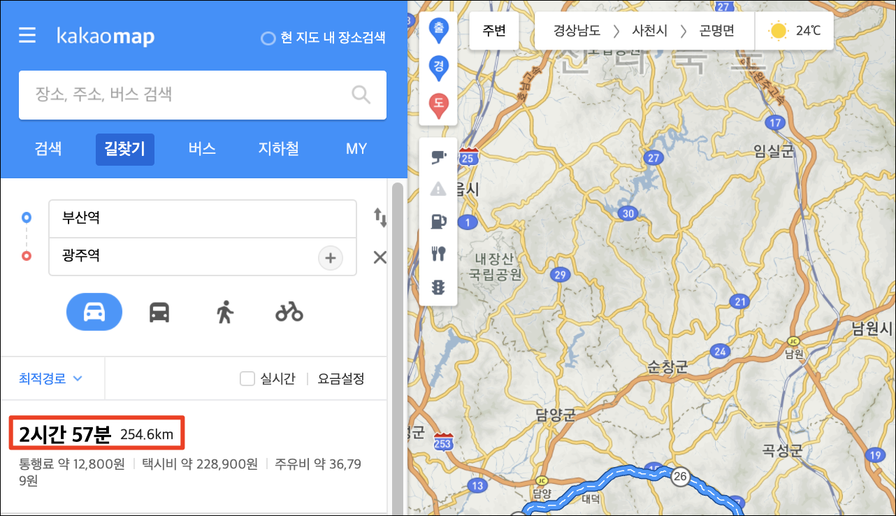 부산역에서 광주역까지 자가용을 타고가면 대략 3시간 정도 걸린다고 나오네요. 휴게소 들리고 하면 3시간 30분은 봐야겠구요.